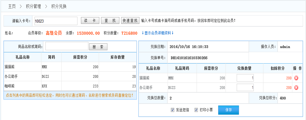 1.發(fā)送短信:如果系統(tǒng)開啟了短信功能,在完成兌換后系統(tǒng)會自動給該會員發(fā)送通知短信,告知會員兌換信息?。ㄩ_啟短信功能在 增值服務(wù)》服務(wù)參數(shù)》短信參數(shù)設(shè)置(對短信進(jìn)行參數(shù)設(shè)置))
