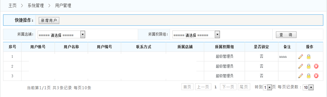 2.查詢:可以所屬店鋪和所屬權(quán)限組查找出符合條件的系統(tǒng)用戶