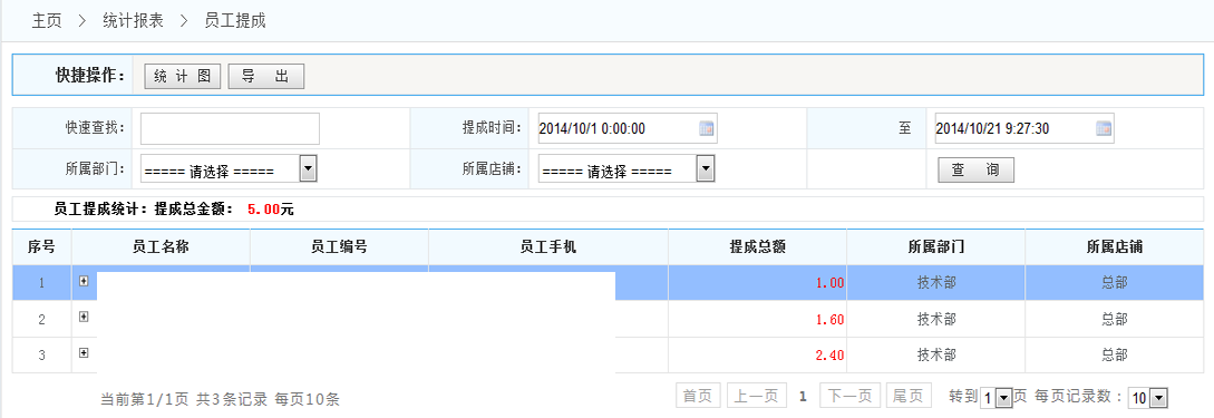 3.員工提成統(tǒng)計(jì):將統(tǒng)計(jì)在滿足設(shè)定的條件下的所有員工提成的概況