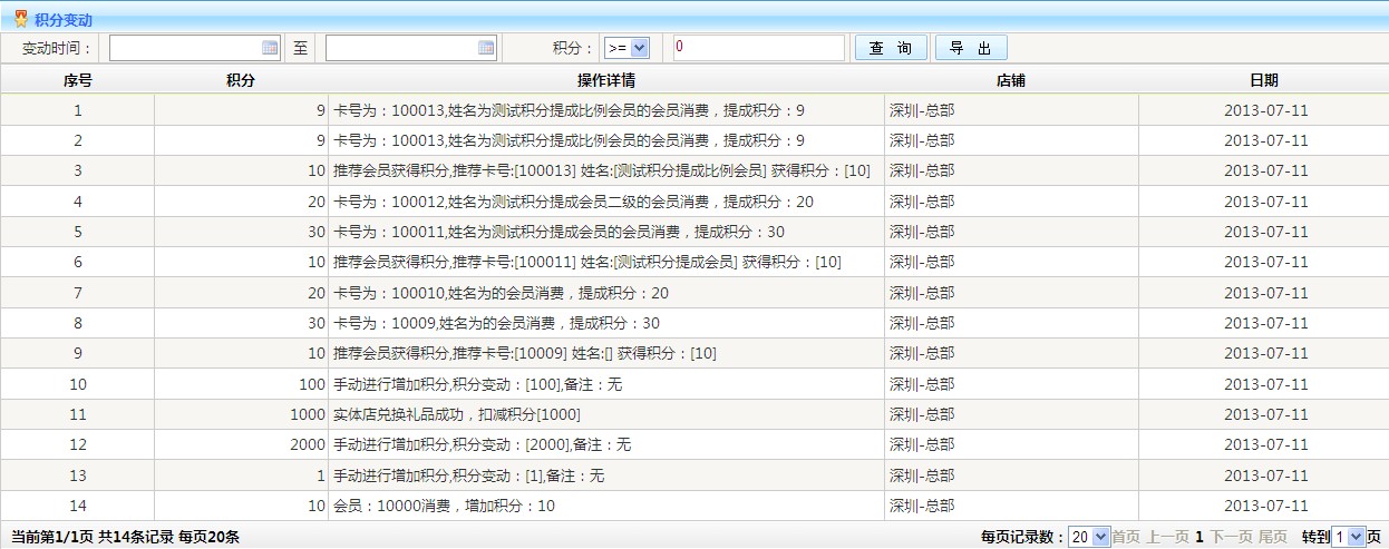 積分變動(dòng): 1.查詢(xún):可以根據(jù)積分的數(shù)量 時(shí)間段等條件查詢(xún) 2.導(dǎo)出:可以將按條件查詢(xún)出來(lái)的數(shù)據(jù),以Excel表格形式導(dǎo)出