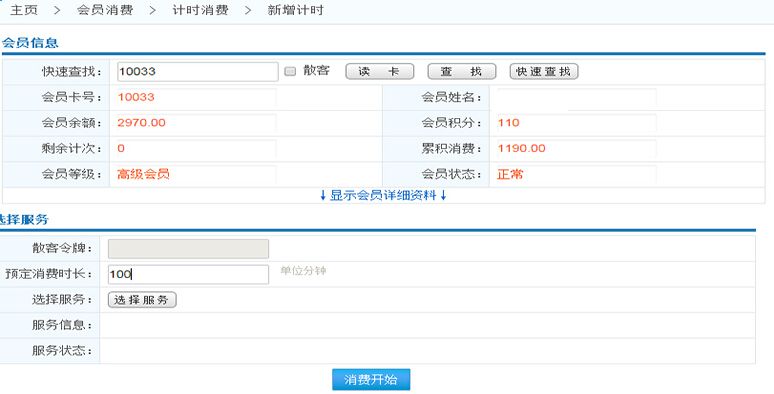 在文本框中輸入會員卡號,可查詢該會員的計(jì)時消費(fèi)記錄
