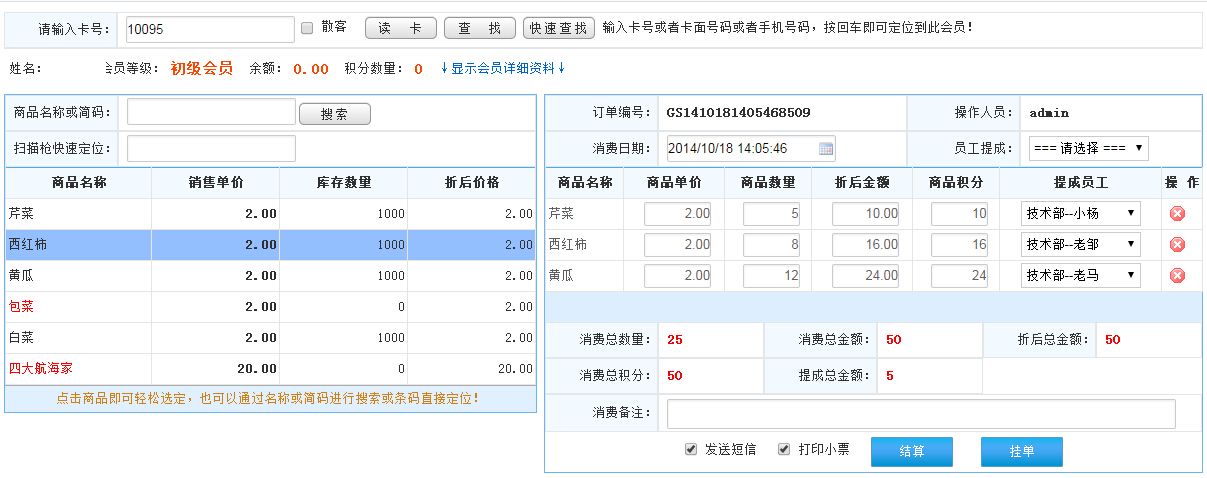 先會員刷卡,然后輸入商品的名稱或簡碼或者掃描槍快速定位查找商品;或者直接點(diǎn)擊商品選擇;選擇商品后點(diǎn)擊結(jié)算此訂單如圖顯示: